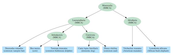 Figur 2: Livets liv for utvalgte pattedyrarter. Hvert sett av arter på et gitt nivå i det nestede hierarkiet har bare den siste felles stamfar. Pattedyr-tre.