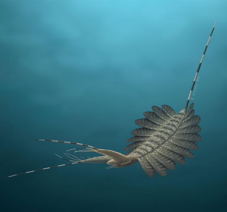 --Den utdøde arter, Kerygmachela kierkegaardi, svømte i havvann under et evolusjonært våpenløp kalt den kambriske eksplosjonen. Flankert av 11 rynkeflapper på hver side av kroppen, fremviste det gamle rovdyret en lang hale og et avrundet hode. Dets fryktelige fremover-vendte vedheng griper byttedyr, sier britisk paleontolog Jakob Vinther, som "gjør livet miserabelt for andre dyr."